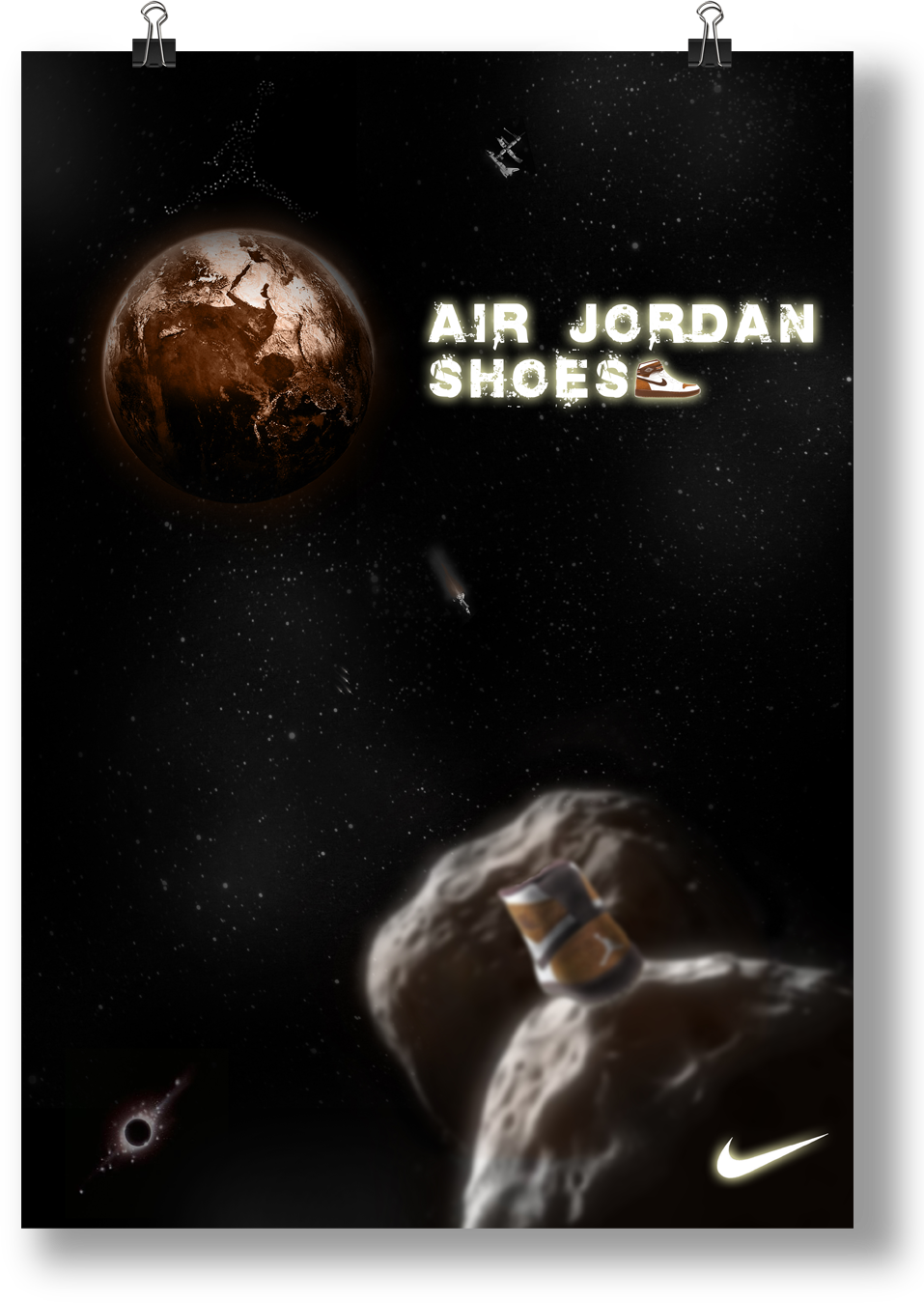 Affiche faisant la promotion des baskets de la célèbre marque Nike. Le but était de promouvoir l'arrivée de certains modèles de baskets. J'ai choisi des Air Jordan One et donc j'ai mis en avant le concept de l'arrivée, avec la mise en situation (astéroïde arrivant sur la Terre) ainsi que le mot «Air» qui m'a inspiré cet environnement spatial.