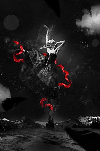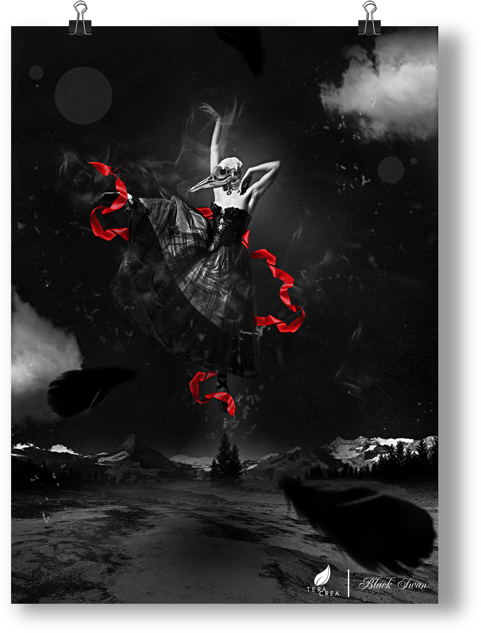 Inspiré par le film réalisé en 2010 par Darren Aronofsky ainsi qu'une personne de mon entourage. Cette affiche exprime le conflit entre la beauté de la danse et le côté maléfique qui peut être présent dans chaque personne. C'est une création assez sombre, avec un contraste fort grâce au ruban rouge. Le crâne de cigne qui remplace le visage de la danseuse, permet de la déshumaniser et renforcer le côté maléfique.