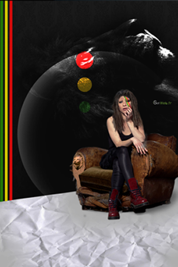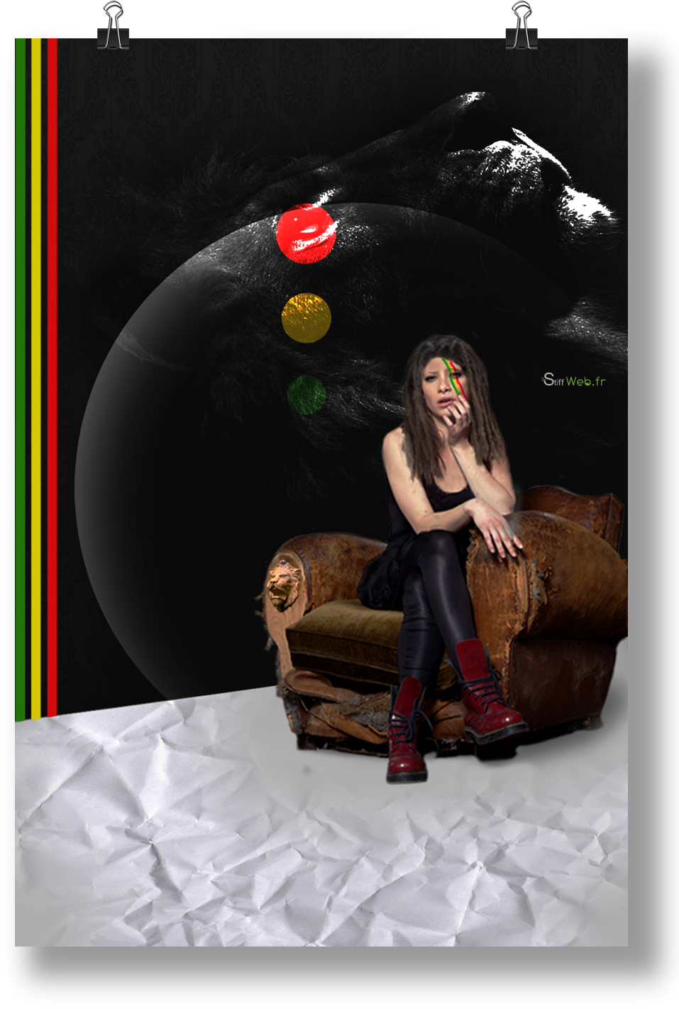Cette création émane d'une demande d'une amie photographe/mannequin, vous pouvez retrouver ses réalisations sur son Book!. Après avoir choisi la photo de base, je me suis concentré sur le thème : la religion rasta. Afin de mieux représenter cet univers, il y a eu des retouches graphiques à réaliser comme l'ajout de dreadlocks ou la modification du fauteuil. Rappel des couleurs de cette religion avec les 3 bandes ainsi que l'esprit animal très important, le Lion.